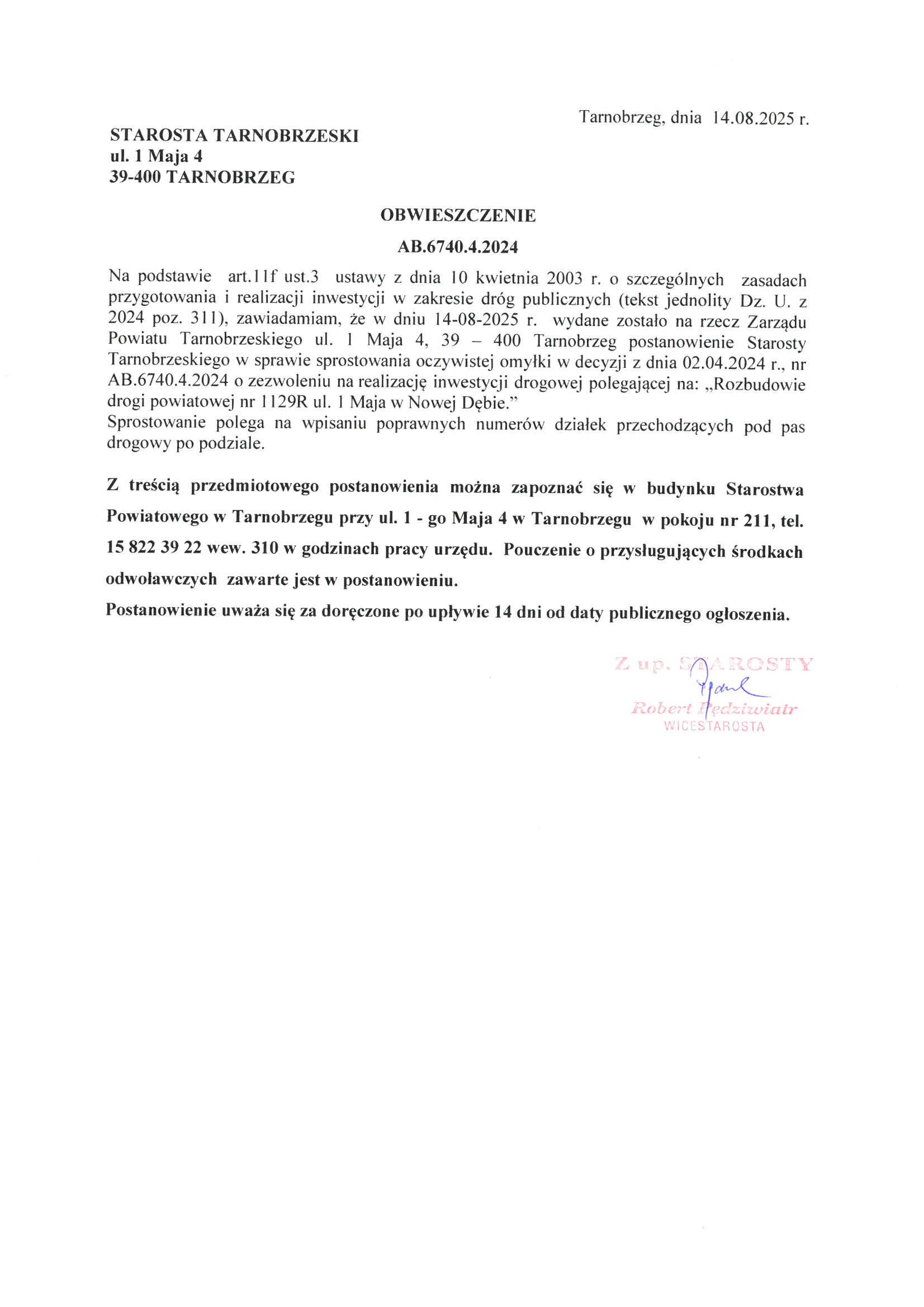 Sprostowanie oczywistej omyłki Starosty Tarnobrzeskiego