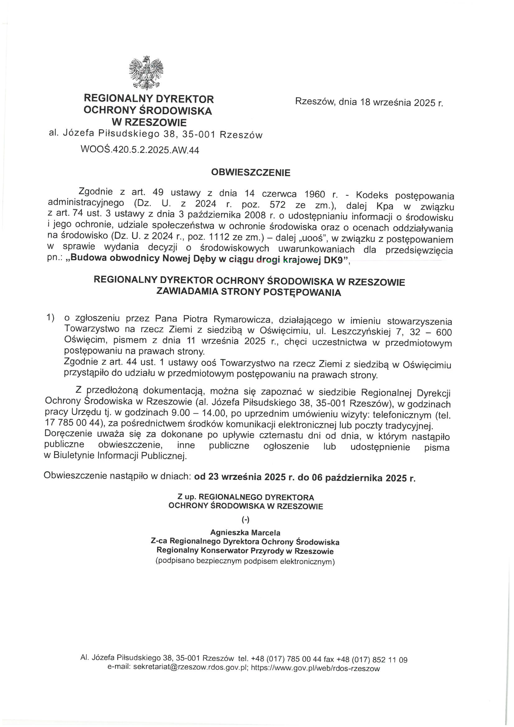 Obwieszczenie Regionalnego Dyrektora Ochrony Środowiska w Rzeszowie z dnia 18 września 2025 r. znak:WOOŚ.420.5.2.2025.AW.44