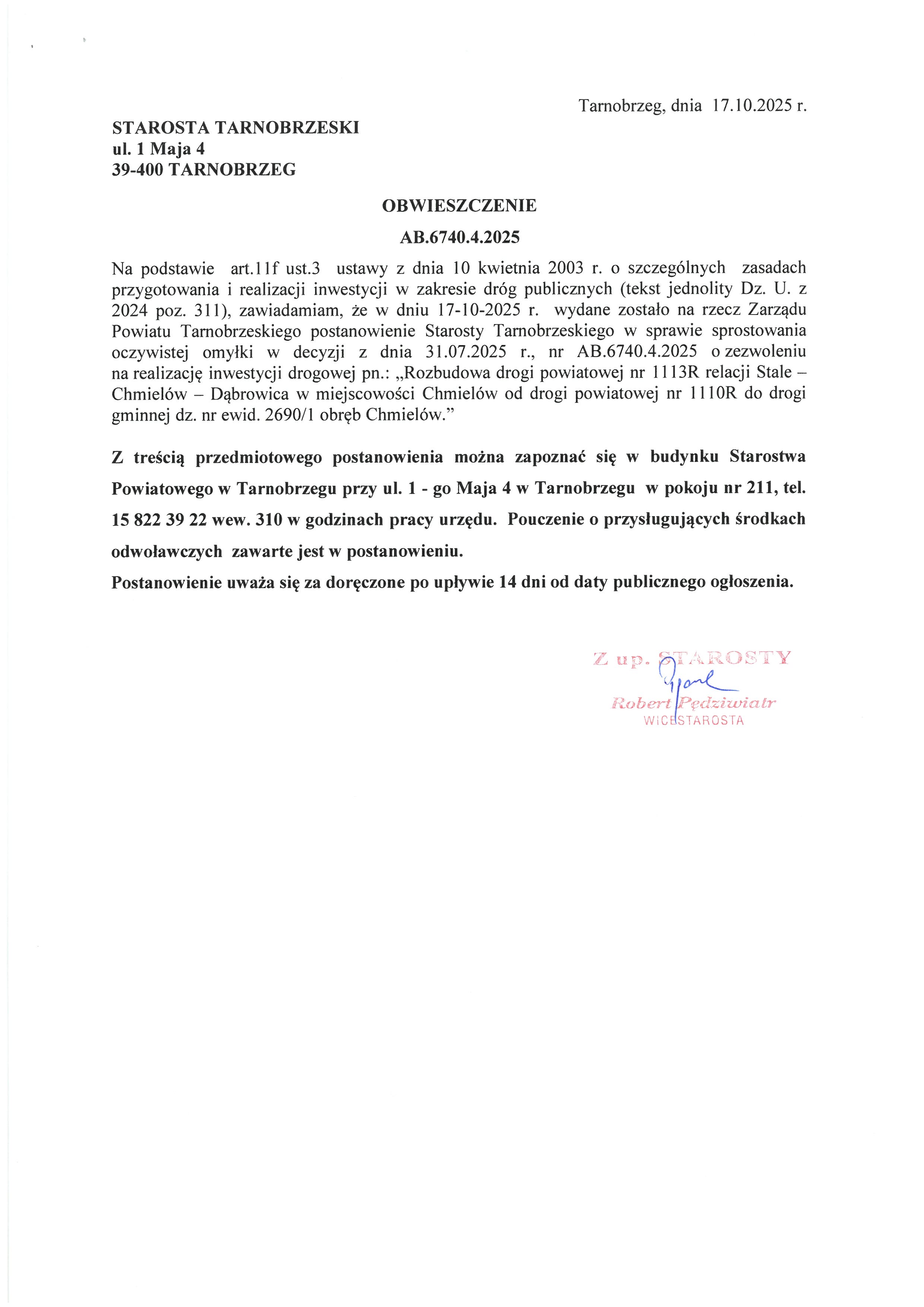Obwieszczenie Starosty Tarnobrzeskiego Nr AB.6740.4.2025