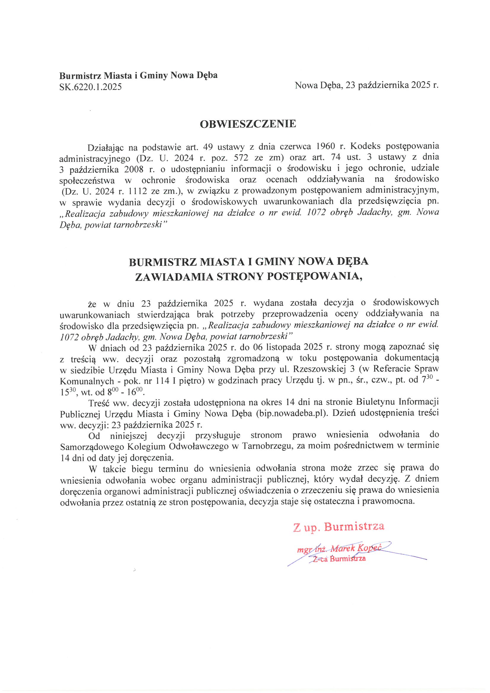 Obwieszczenie Burmistrza Miasta i Gminy Nowa Dęba z dnia 23 października 2025 r. znak:SK.6220.1.2025