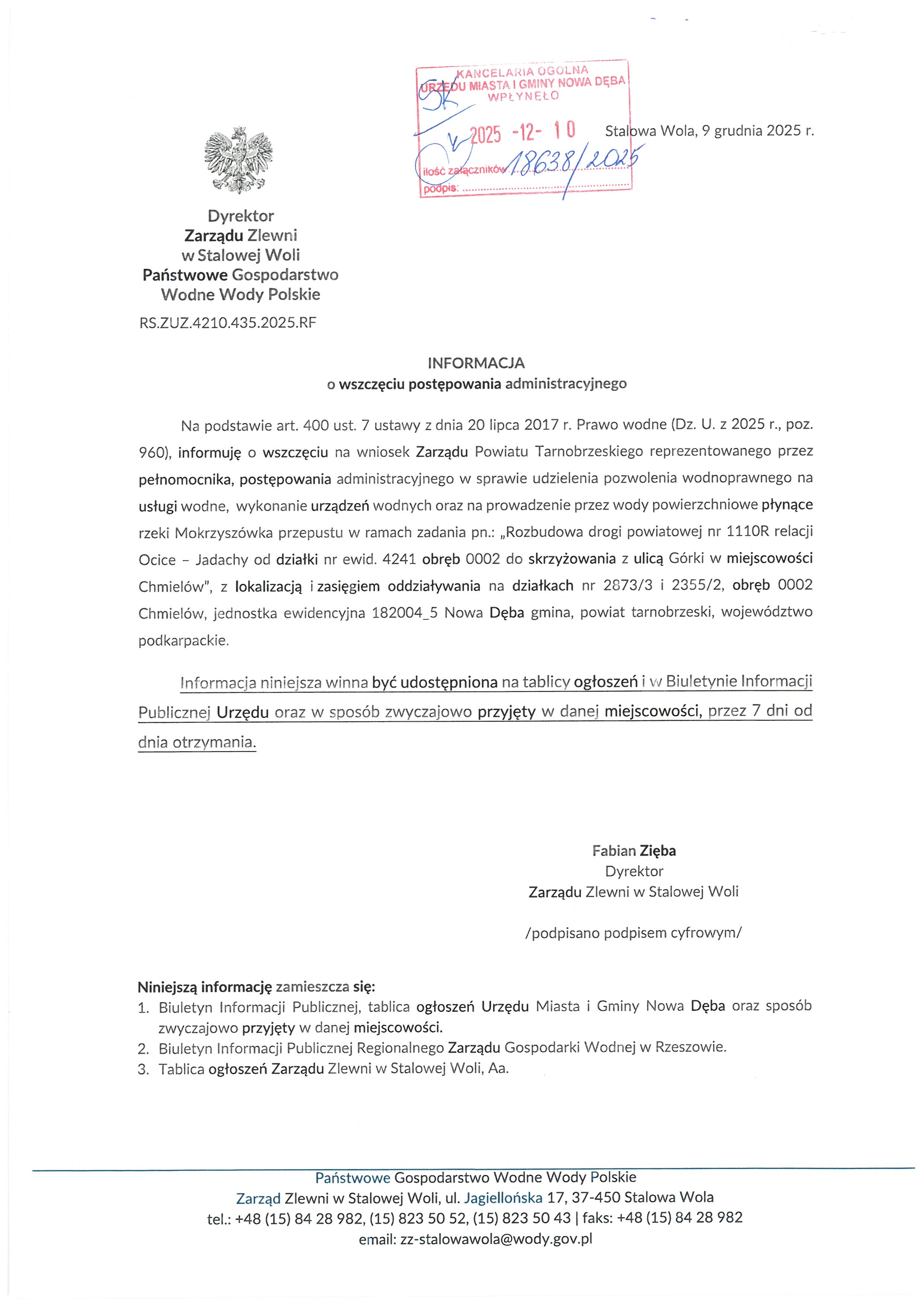 Informacja Dyrektora Zarządu Zlewni w Stalowej Woli