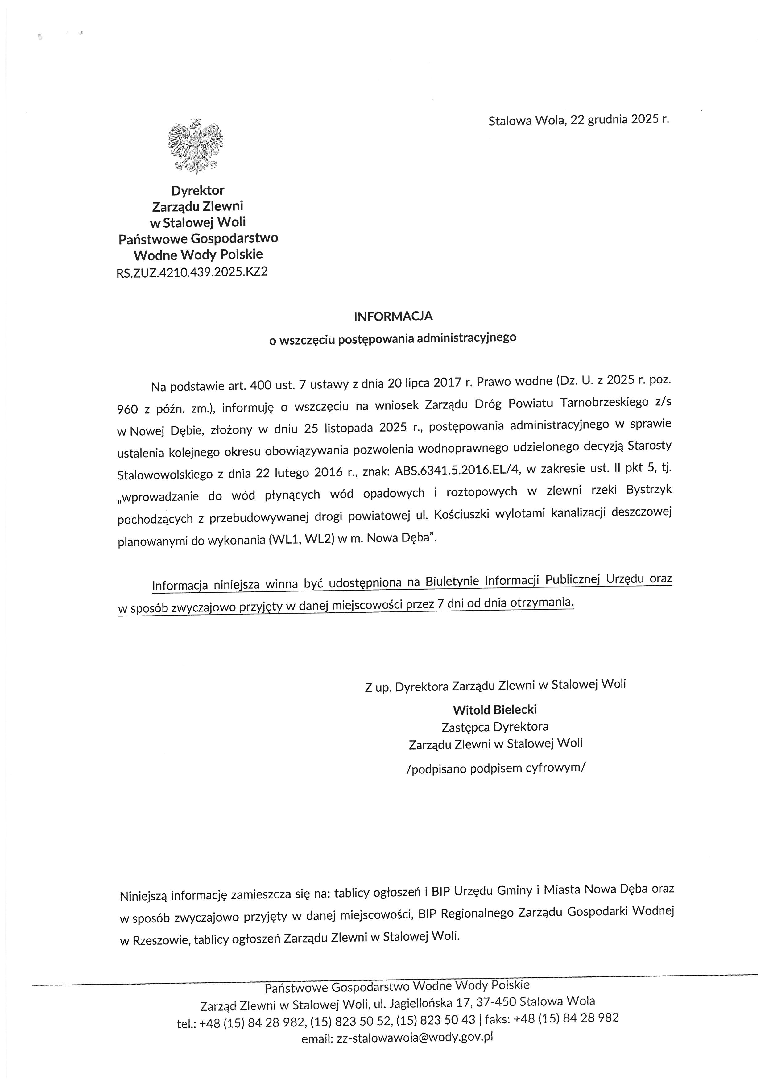 Informacja Dyrektora Zarządu Zlewni w Stalowej Woli