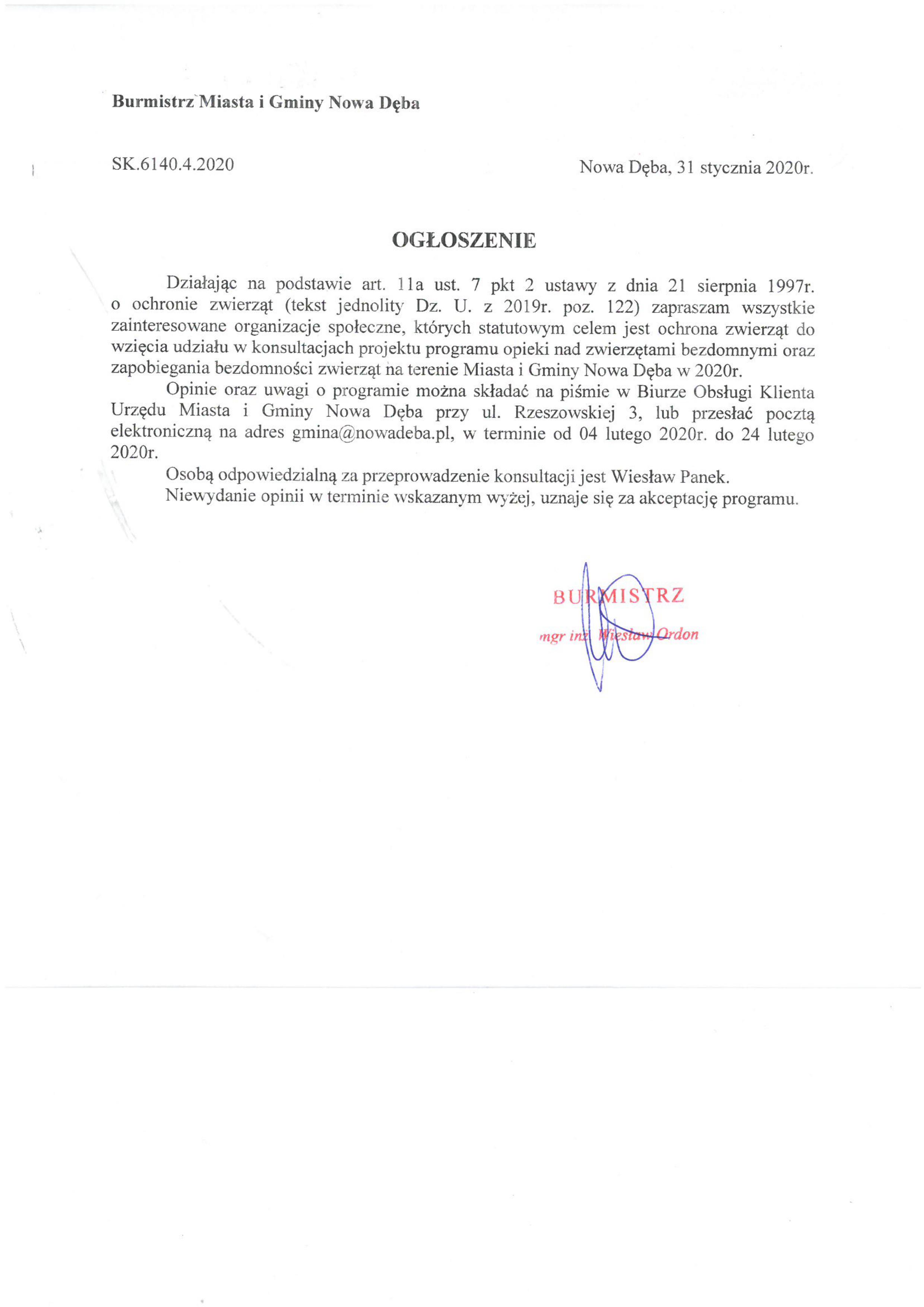 Ogłoszenie Burmistrza Miasta i Gminy Nowa Dęba z 31.01.2020r. GKS.6140.4.2020