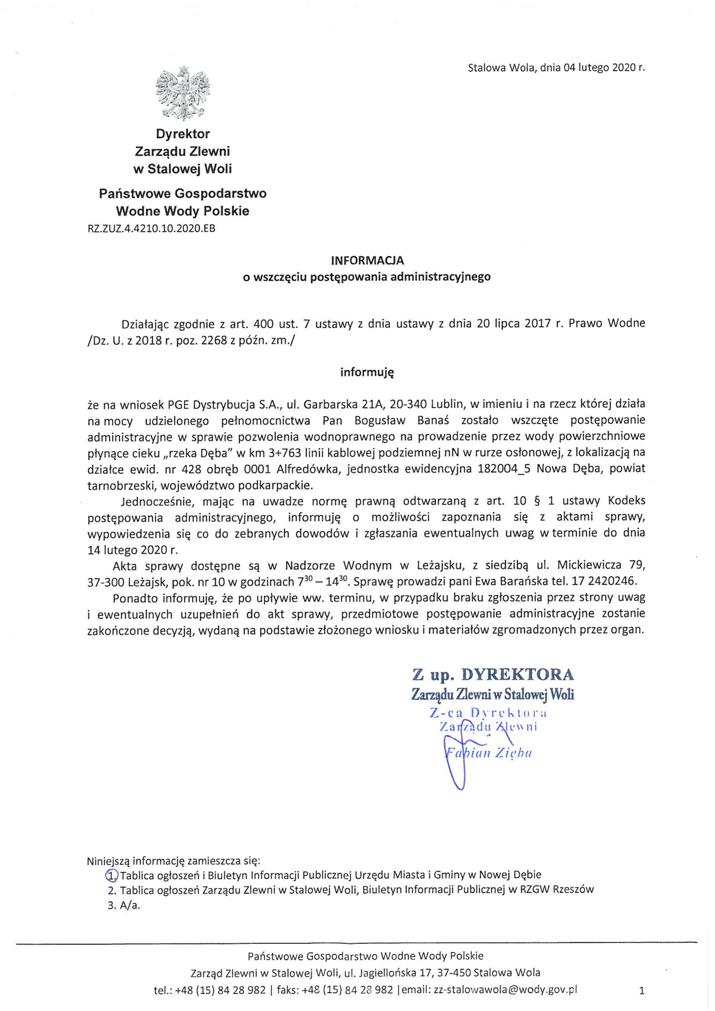 Informacja PGW Wody Polskie o wszczęciu postępowania-RZ.ZUZ.4.421.10.2020.EB