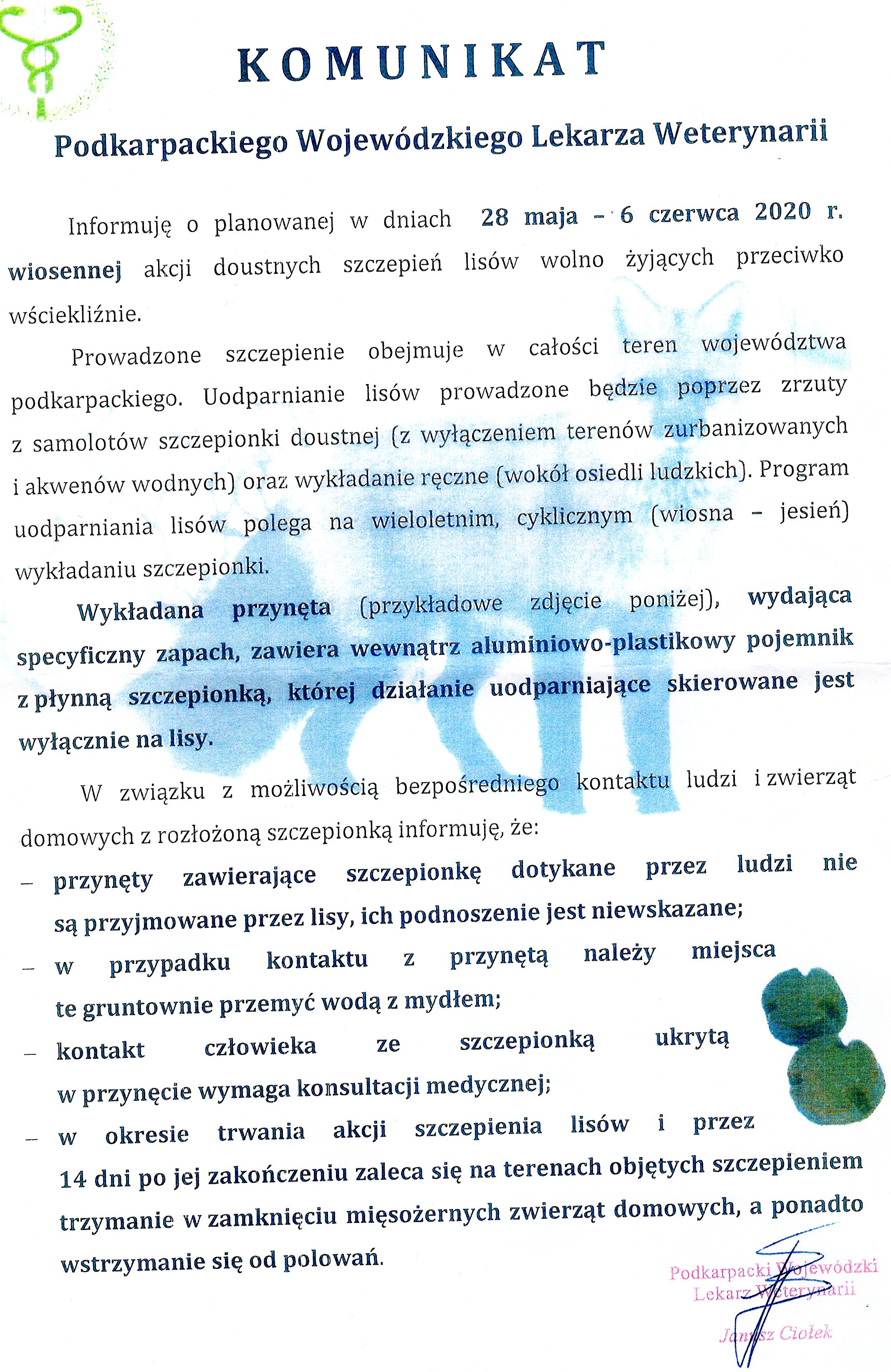 Informacja o szczepieniach ochronnych lisów wolno żyjących przeciwko wściekliźnie