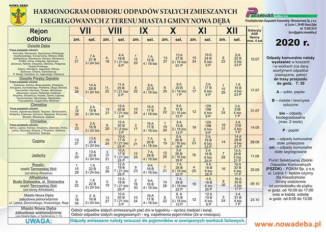 Przedstawiamy aktualny harmonogram odbioru odpadów stałych zmieszanych i segregowanych z terenu Miasta i Gminy Nowa Dęba na II półrocze 2020 r.