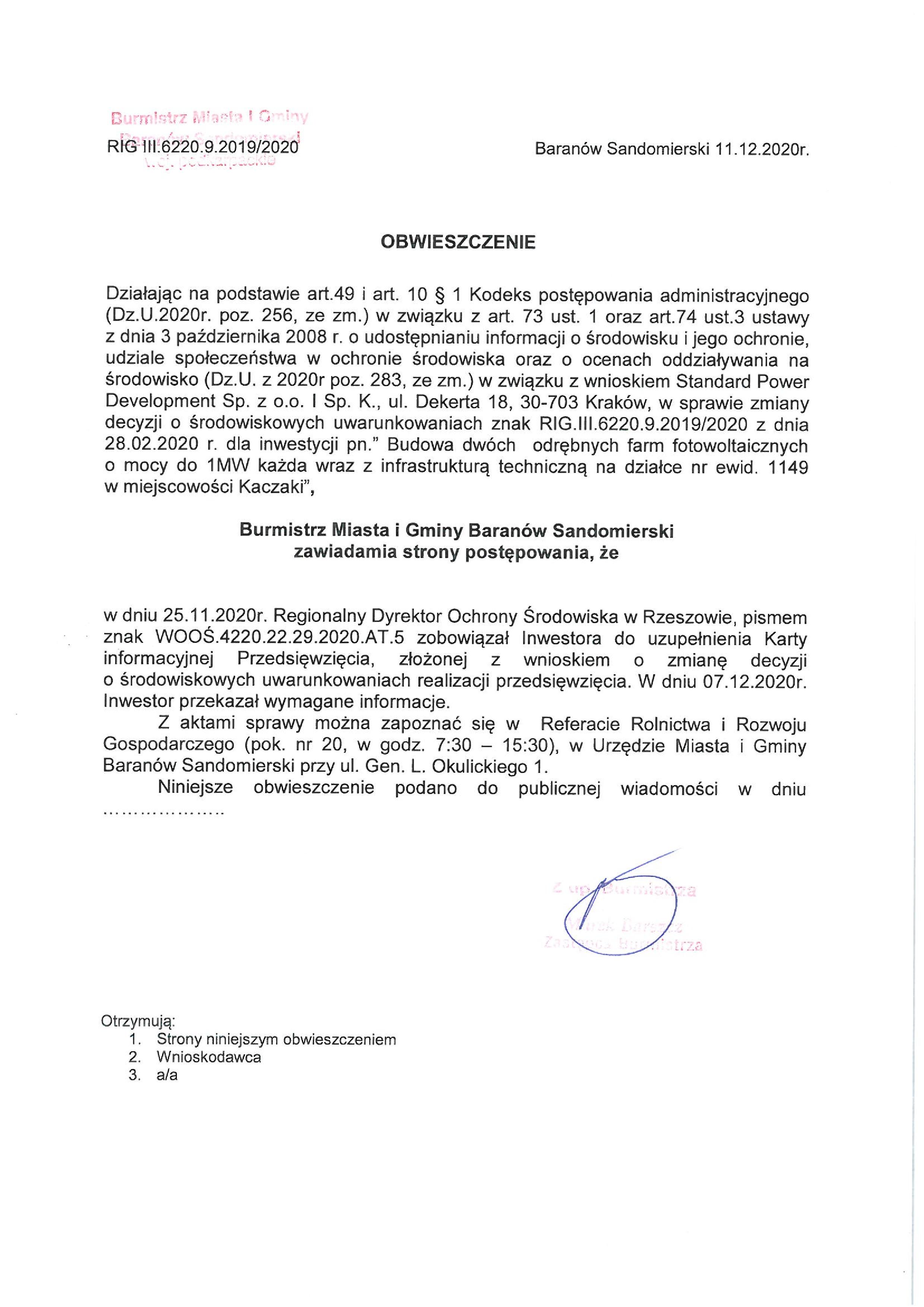 Obwieszczenie Burmistrza Miasta i Gminy Baranów Sandomierski RIG III.6220.9.2019/2020 z dnia 11.12.2020 r.