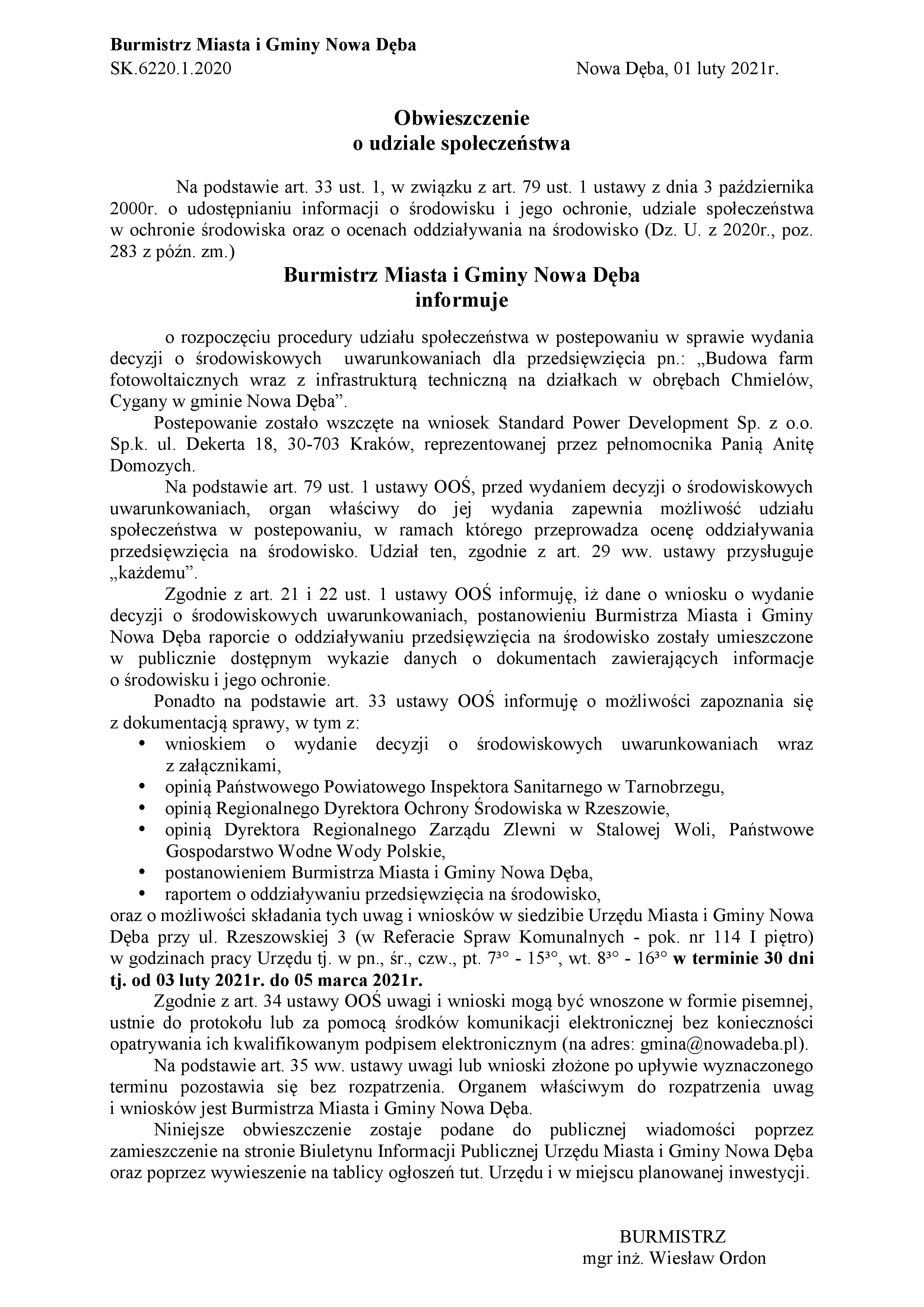 Obwieszczenie o udziale społeczeństwa Burmistrza Miasta i Gminy Nowa Dęba SK.6220.1.2020 z dnia 1 lutego 2021 r.