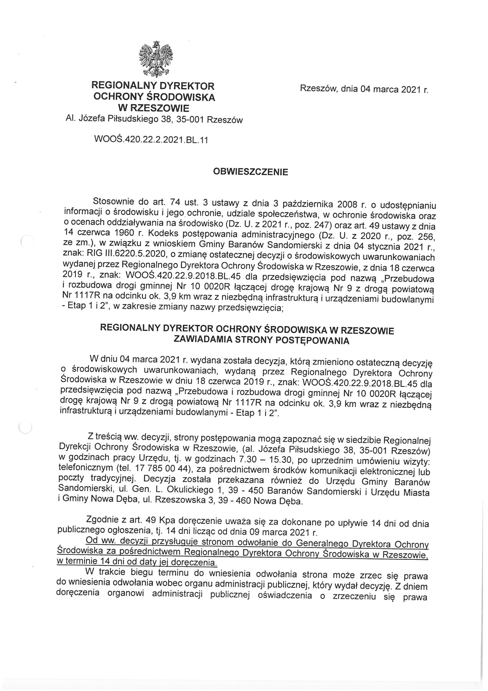 Obwieszczenie Regionalnego Dyrektora Ochrony Środowiska w Rzeszowie z 04.03.2021 r. znak: WOOŚ.420.22.2.2021.BL.11
