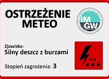 Prognozowane są opady deszczu o natężeniu umiarkowanym i silnym. Wysokość opadu miejscami od 80 mm do 100 mm. Opadom towarzyszyć będą burze z porywami wiatru do 80 km/h, które wystąpią głównie w ciągu dnia. Lokalnie grad. Treść ogłoszenia w załączeniu.