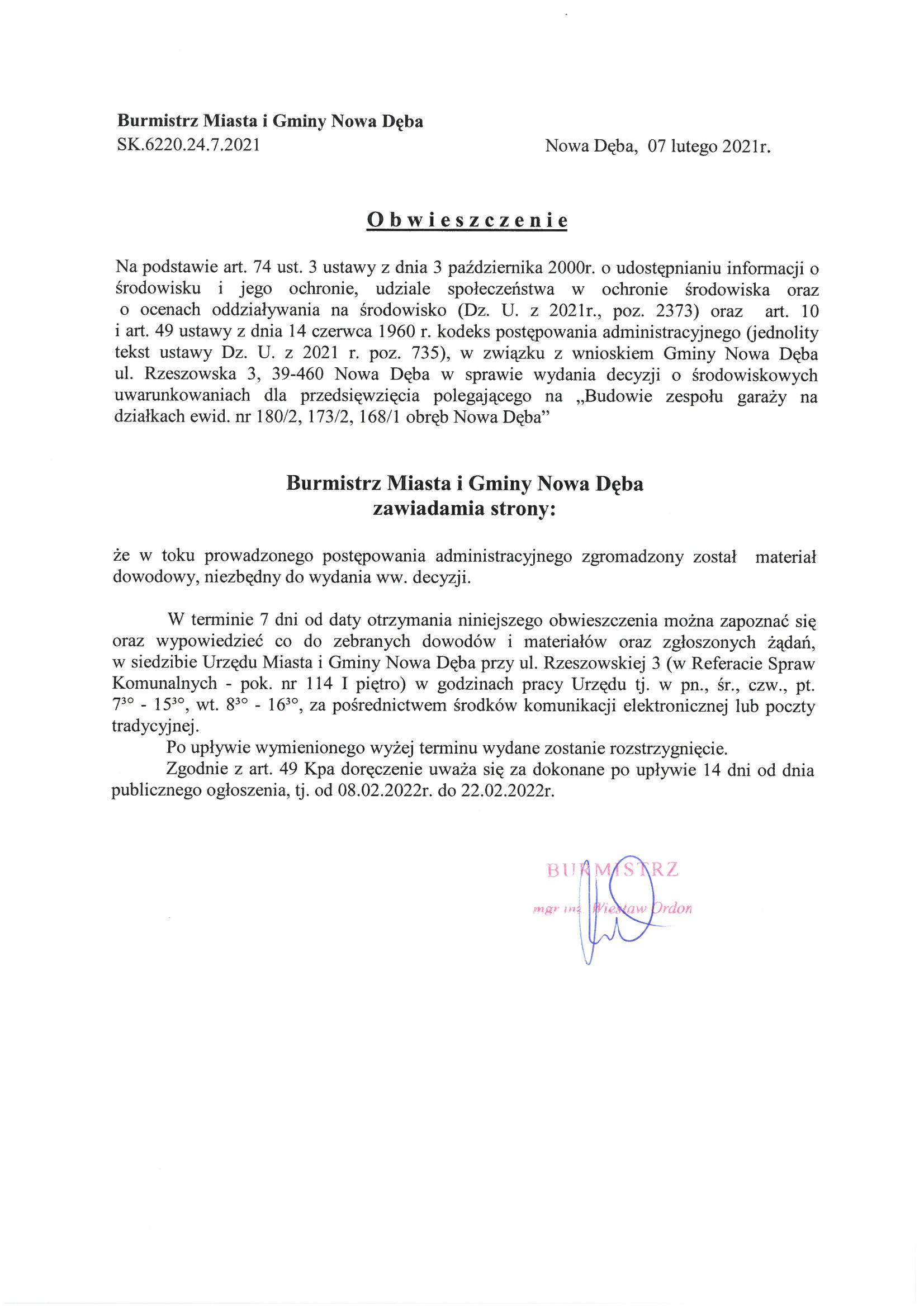 Obwieszczenie Burmistrza Miasta i Gminy Nowa Dęba z dnia 7 lutego 2022r. znak: SK.6220.24.7.2021