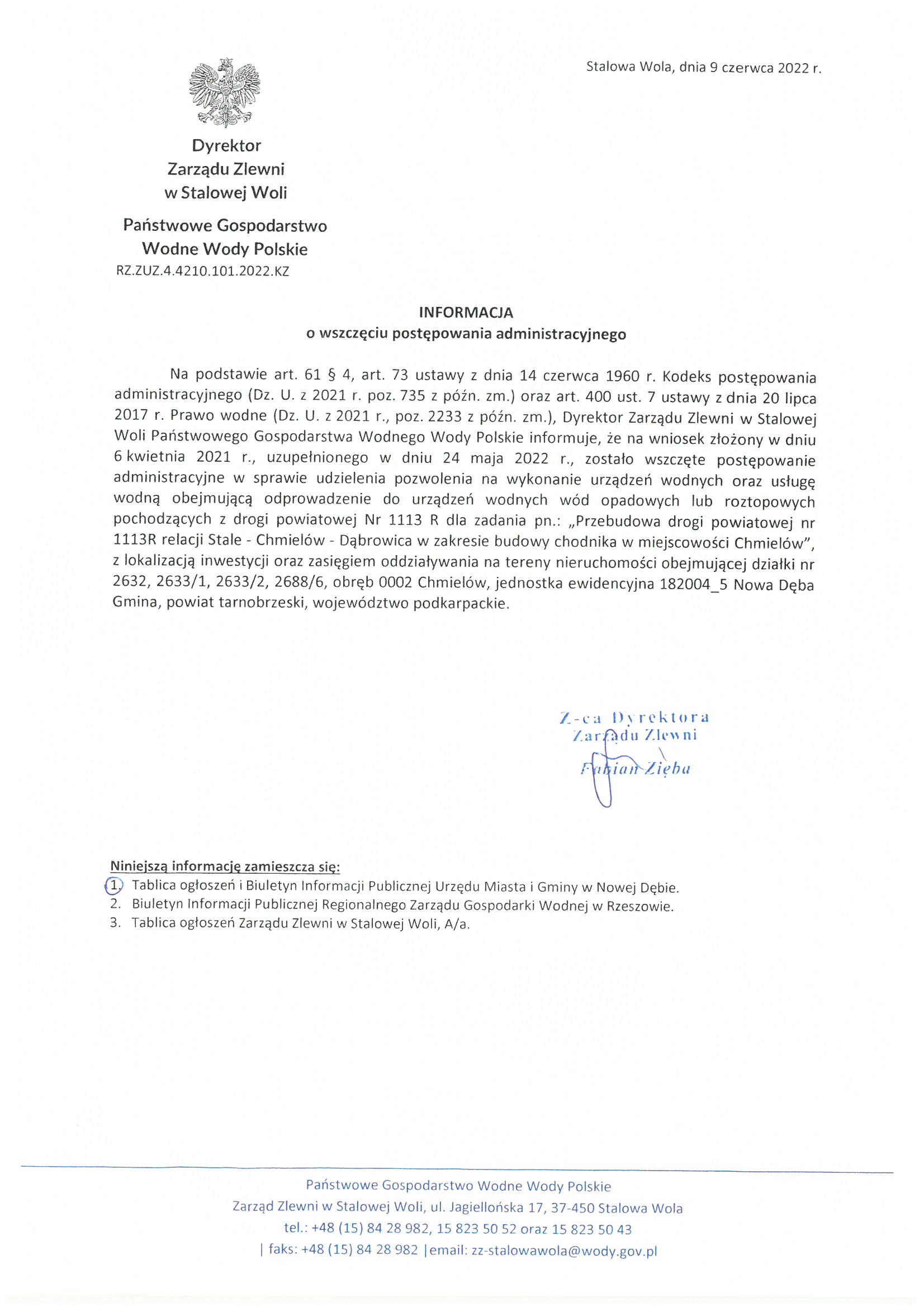 Informacja z dnia 9 czerwca 2022 r. Dyrektora Zarządu Zlewni w Stalowej Woli, Państwowe Gospodarstwo Wodne Wody Polskie