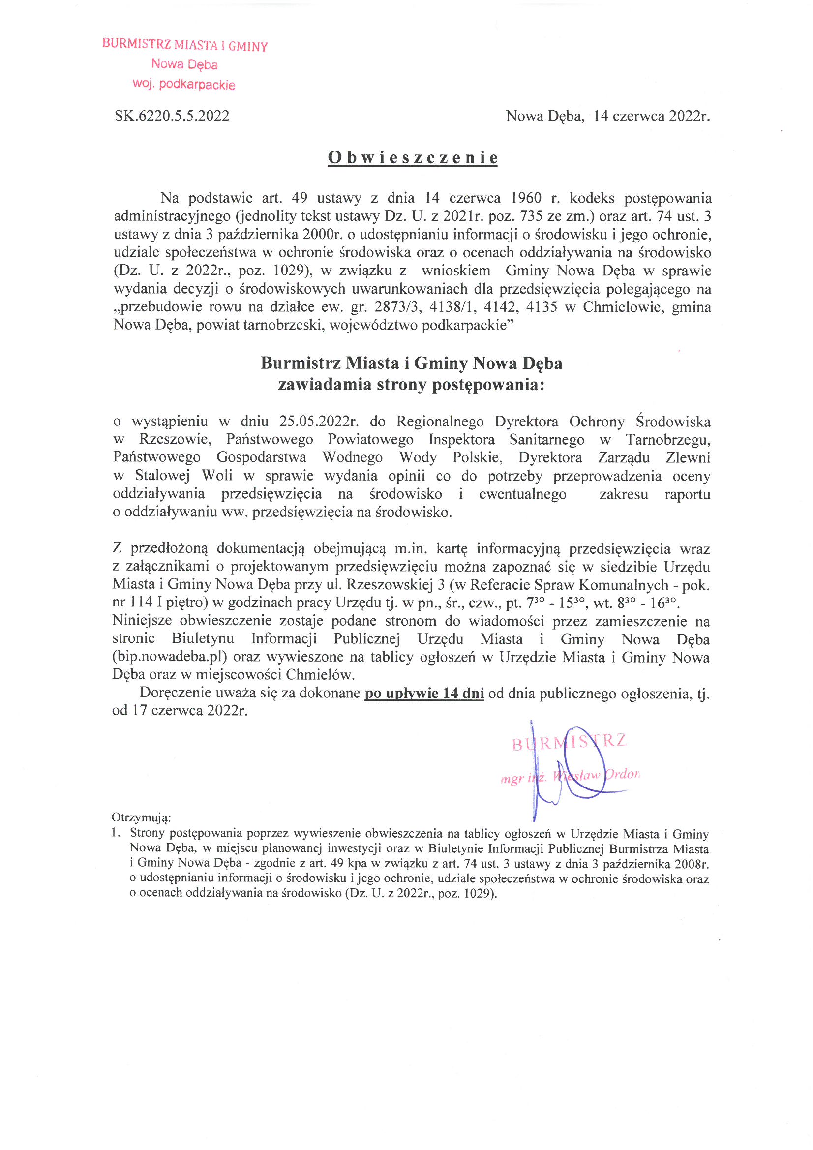 Obwieszczenie z dnia 14.06.2022r. Burmistrza Miasta i Gminy Nowa Dęba znak SK.6220.5.5.2022