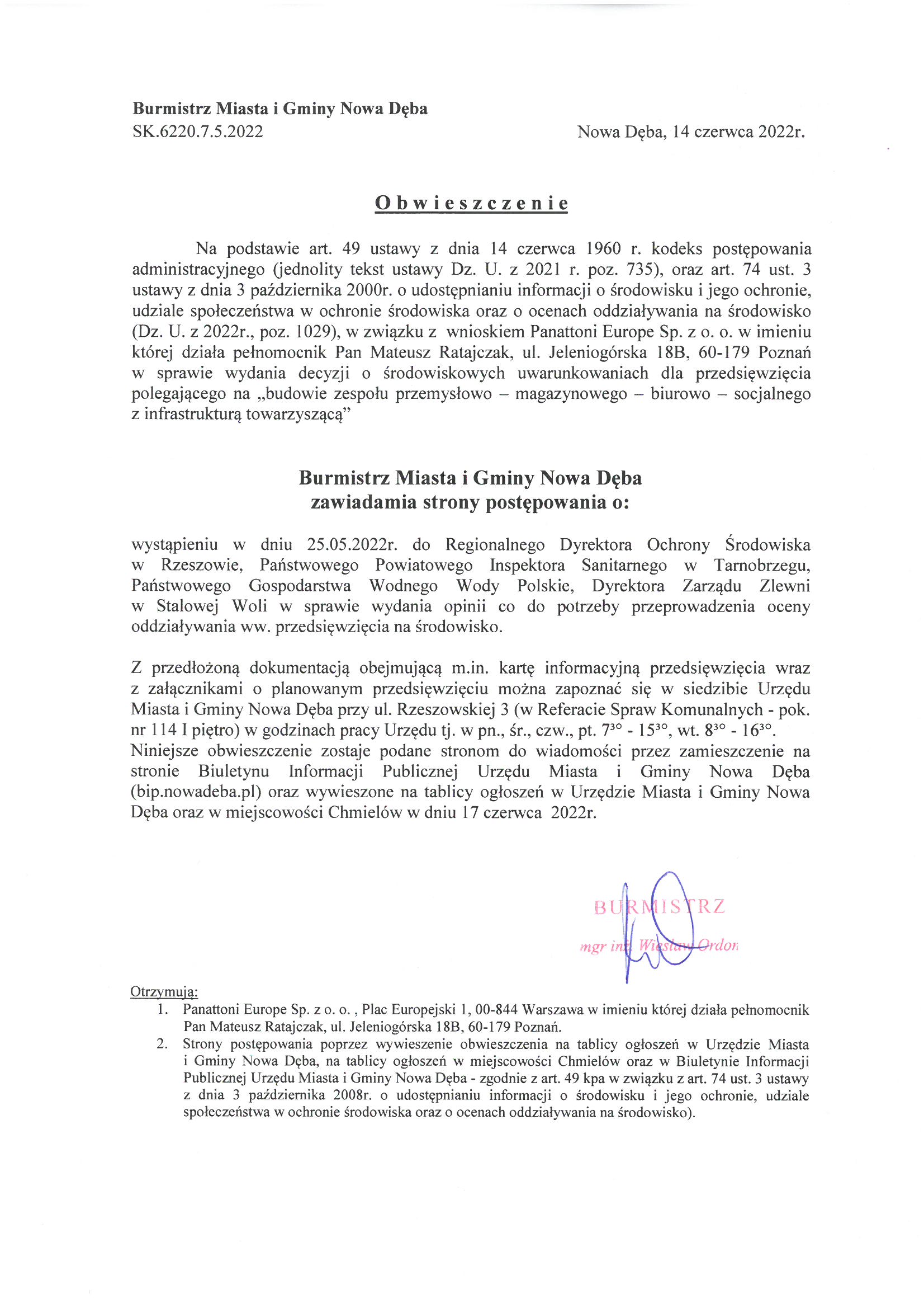 Obwieszczenie z dnia 14.06.2022r. Burmistrza Miasta i Gminy Nowa Dęba znak SK.6220.7.5.2022