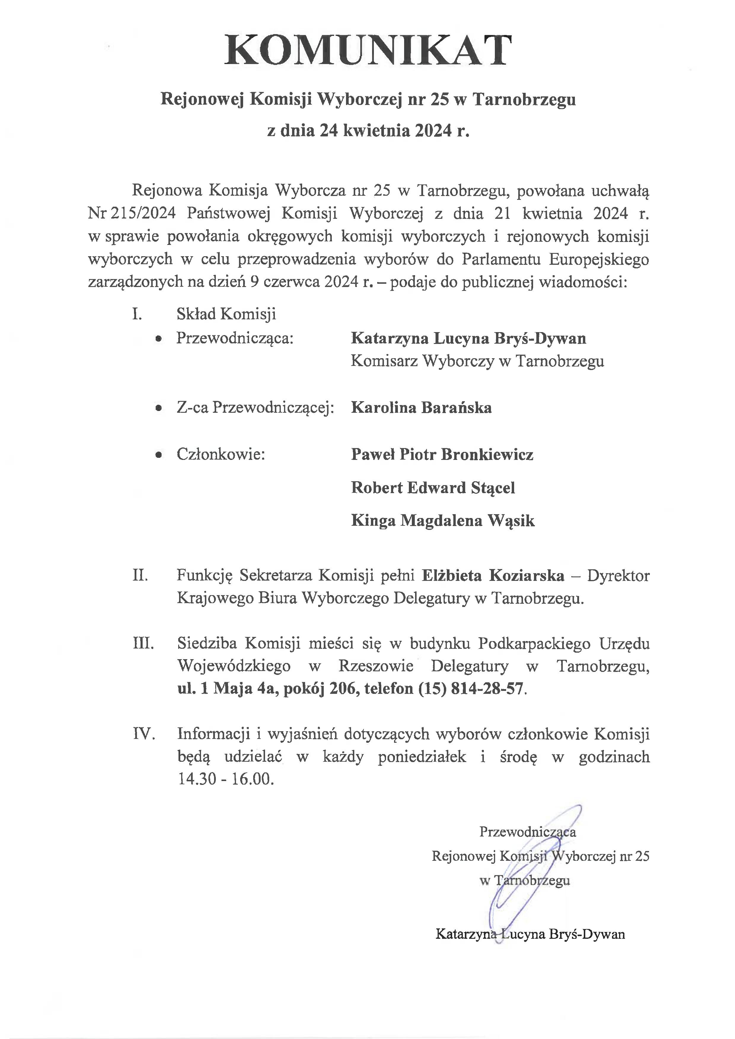 Komunikat Rejonowej Komisji Wyborczej nr 25 w Tarnobrzegu
