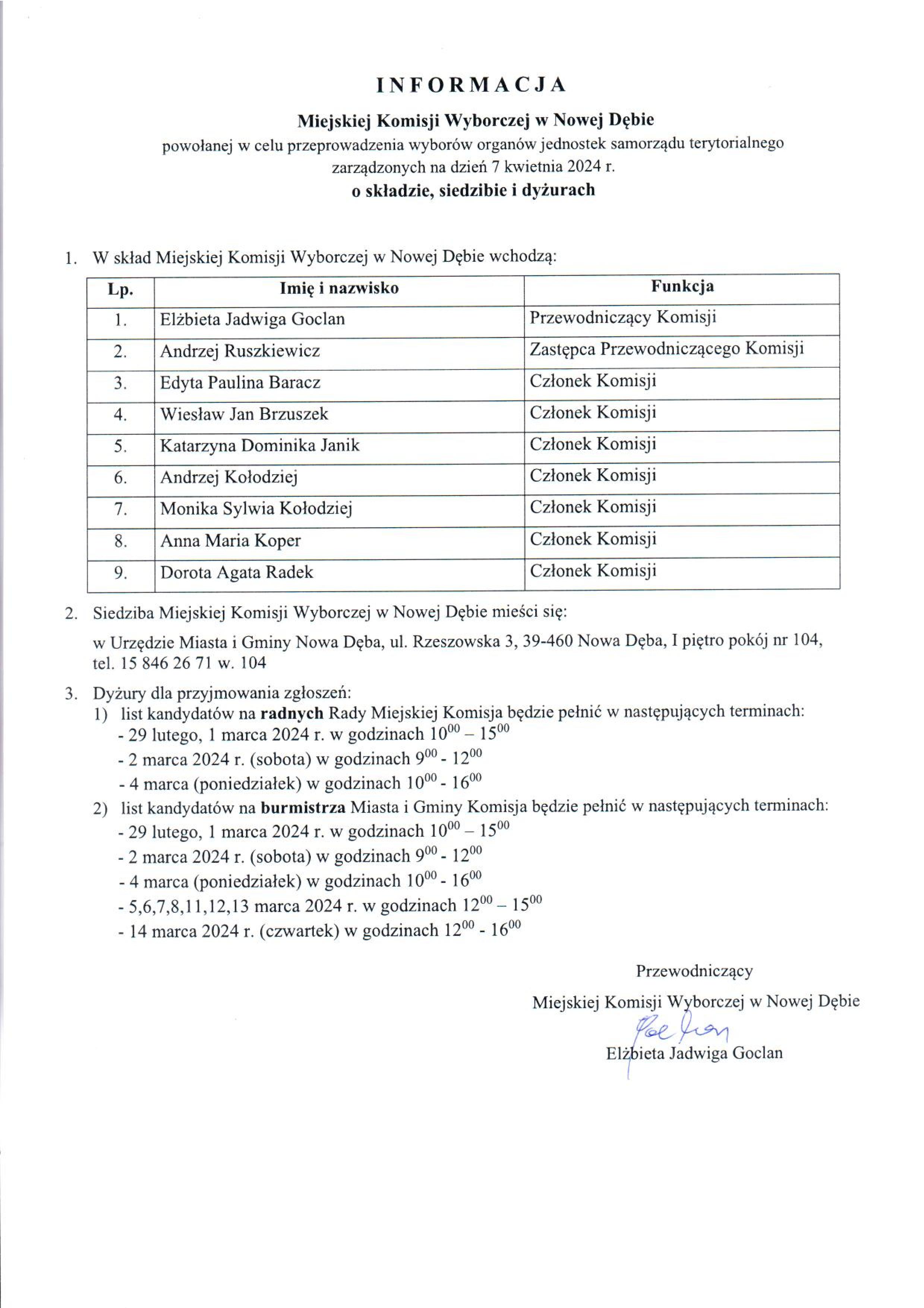 Informacja Miejskiej Komisji Wyborczej w Nowej Dębie o składzie, siedzibie i dyżurach