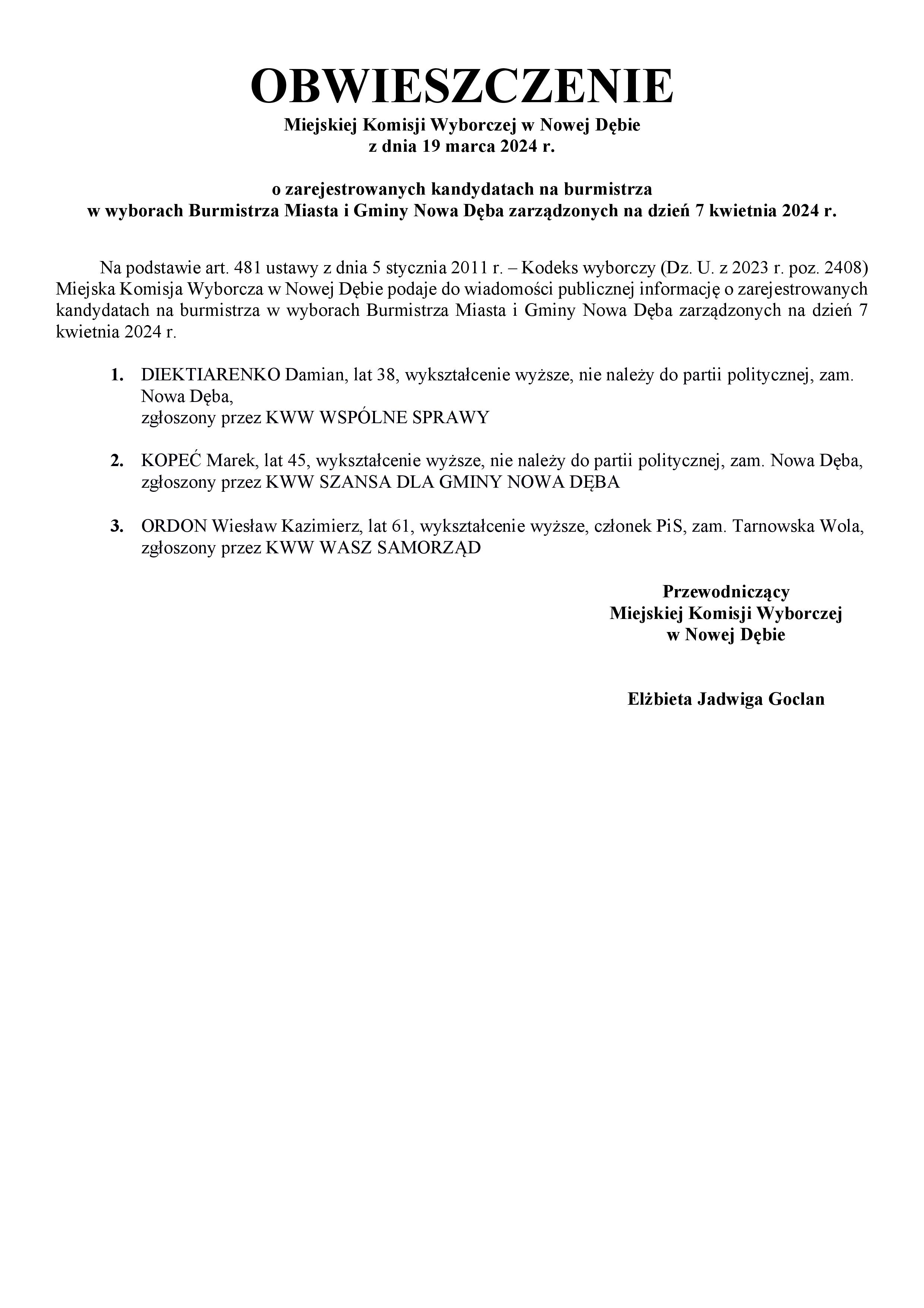 Obwieszczenie Miejskiej Komisji Wyborczej w Nowej Dębie