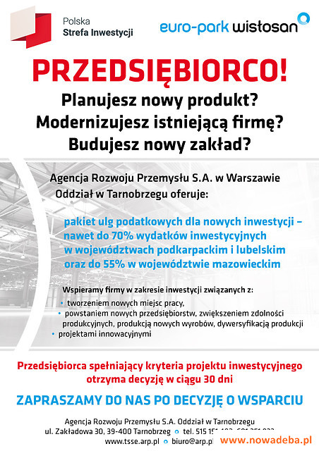 Agencja Rozwoju Przemysłu S.A. w Warszawie Oddział w Tarnobrzegu oferuje wsparcie dla przedsiębiorców - pakiet ulg podatkowych dla nowych inwestycji oraz pomoc w tworzeniu nowych miejsc pracy czy zwiększeniu zdolności produkcyjnych.