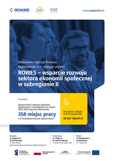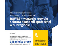 Rzeszowska Agencja Rozwoju Regionalnego S.A. zaprasza do udziału w projekcie „ROWES -wsparcie rozwoju sektora ekonomii społecznej w subregionie II” realizowanego w ramach Regionalnego Programu Operacyjnego Województwa Podkarpackiego na lata 2014-2020. Oś priorytetowa VIII Integracja społeczna, Działanie 8.5 Wspieranie rozwoju sektora ekonomii społecznej w regionie.