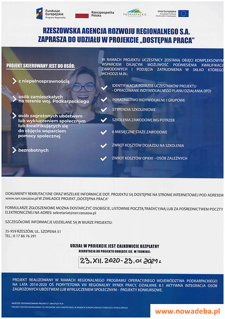 Rzeszowska Agencja Rozwoju Regionalnego S.A. zaprasza do udziału w projekcie „Dostępna praca” realizowanego w ramach Regionalnego Programu Operacyjnego Województwa Podkarpackiego na lata 2014-2020, Działanie 8.1 „Aktywna integracja osób zagrożonych ubóstwem lub wykluczeniem społecznym”, współfinansowanego z Europejskiego Funduszu Społecznego - projekty konkursowe.