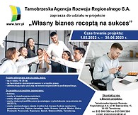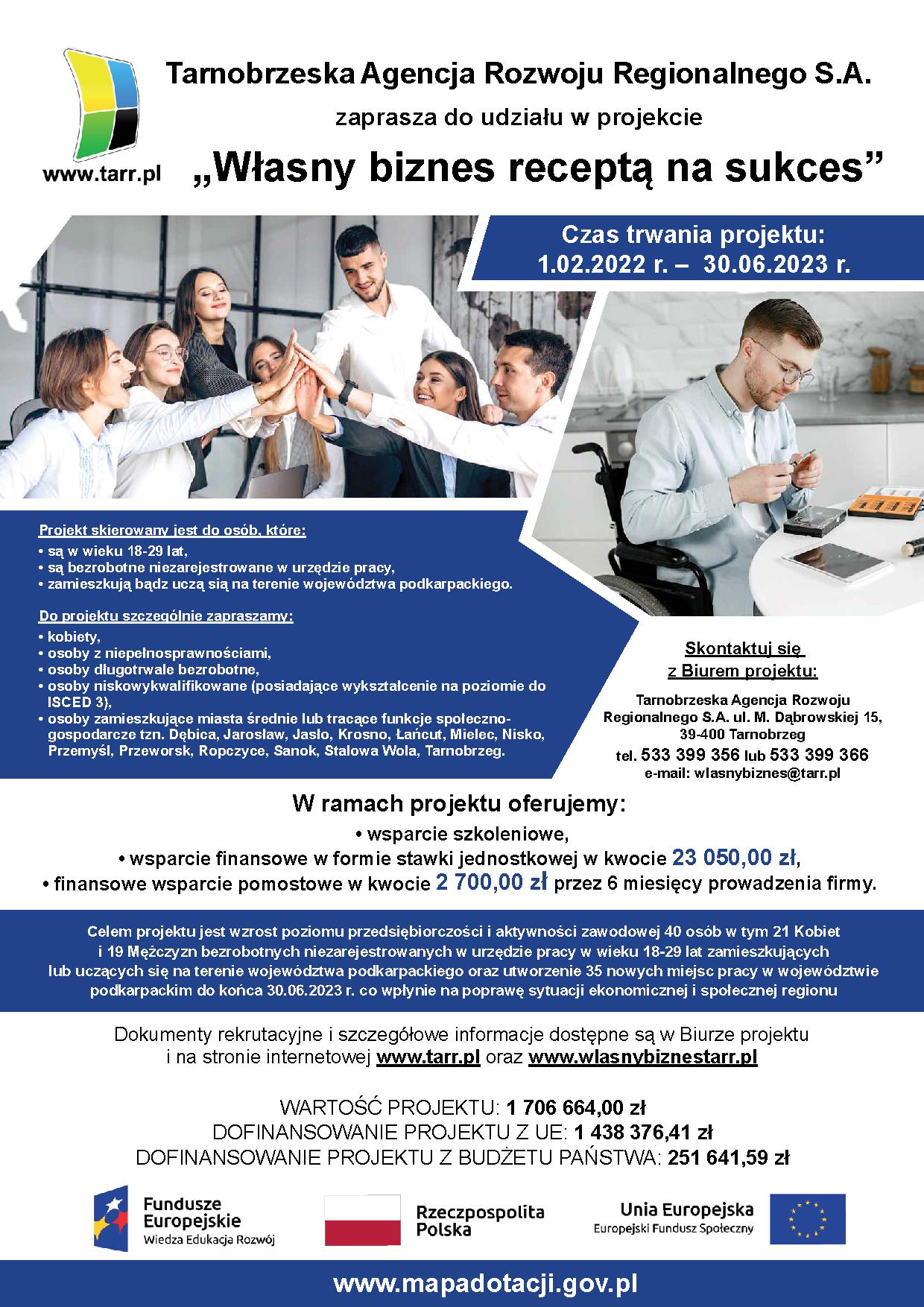 Tarnobrzeska Agencja Rozwoju Regionalnego S.A. informuje, iż nabór formularzy rekrutacyjnych do projektu pt. "Własny biznes receptą na sukces" zostaje wydłużony do dnia 6 maja 2022 r. Projekt jest współfinansowany ze środków Europejskiego Funduszu Społecznego realizowanego na podstawie umowy z Wojewódzkim Urzędem Pracy w Rzeszowie, pełniącym rolę Instytucji Pośredniczącej w ramach Programu Operacyjnego Wiedza Edukacja Rozwój 2014-2020.