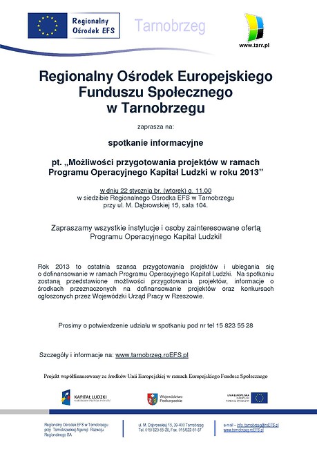 Rok 2013 to rok ostatnich możliwości ubiegania się o środki z Europejskiego Funduszu Społecznego. Wojewódzki Urząd Pracy w Rzeszowie właśnie przedstawił Plany Działania na ten rok, czyli informacje o tym, kiedy i jakie projekty można przygotować oraz kwoty, które zostały przeznaczone na ich sfinansowanie. Najbardziej zainteresowane tymi środkami będą szkoły, stowarzyszenia oraz wszystkie instytucje działające na rzecz osób niepełnosprawnych. Największe środki zostały skierowane na szkolenia, kursy, warsztaty dla osób niepełnosprawnych, pomoc dla zwalnianych pracowników w ramach procesów restrukturyzacyjnych w firmach oraz na programy rozwojowe dla szkół. Informacje o możliwościach przygotowywania projektów i otrzymaniu dofinansowania zostaną przedstawione na bezpłatnym spotkaniu informacyjnym w dniu 22.01.2012 organizowanym przez Regionalny Ośrodek EFS w Tarnobrzegu-instytucje, która pomaga przygotować takie projekty. Spotkanie odbędzie się Sali Tarnobrzeskiej Agencji Rozwoju Regionalnego przy ul. M. Dąbrowskiej 15. Początek spotkania o godz. 11.00.