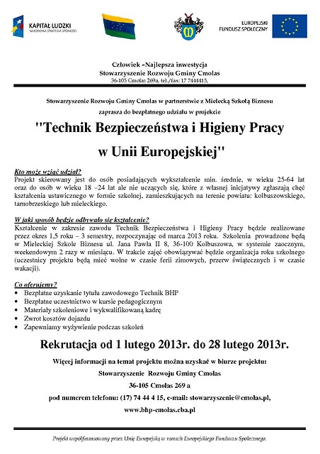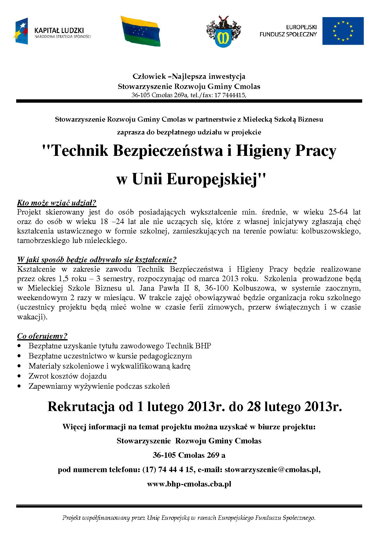 Zaproszenie do bezpłatnego udziału w projekcie "Technik Bezpieczeństwa i Higieny Pracy w Unii Europejskiej"