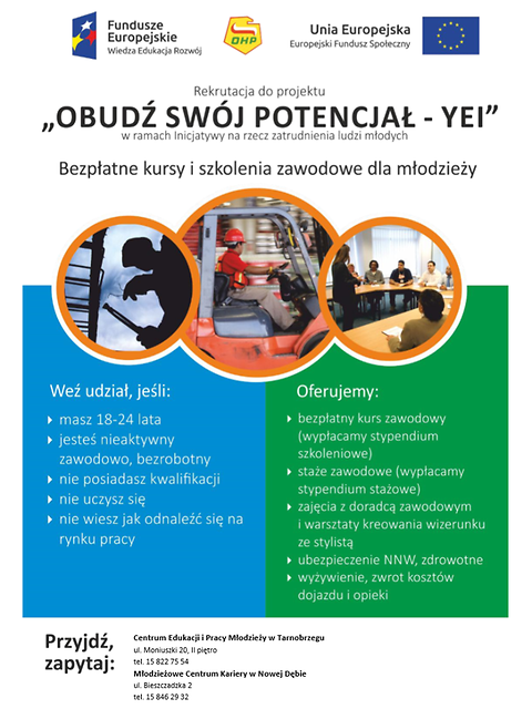 Rekrutację w ramach projektu „Obudź swój potencjał” prowadzi Centrum Edukacji i Pracy Młodzieży w Tarnobrzegu oraz Młodzieżowe Centrum Kariery w Nowej Dębie Udział w szkoleniach jest bezpłatny.