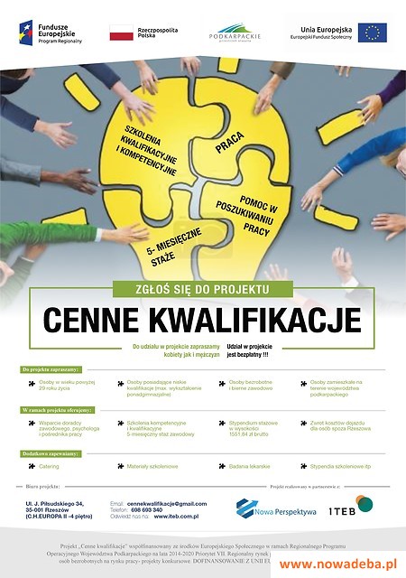 W związku z rozpoczęciem realizacji projektu pn. „Cenne kwalifikacje”, współfinansowanego ze środków Europejskiego Funduszu Społecznego, w ramach Programu Operacyjnego Regionalny Program Operacyjny Województwa Podkarpackiego na lata 2014-2020 Priorytet VII. Regionalny rynek pracy Działanie 7.1. Poprawa sytuacji osób bezrobotnych na rynku pracy- projekty konkursowe, informujemy o możliwości skorzystania ze wsparcia dla osób pozostających bez zatrudnienia.