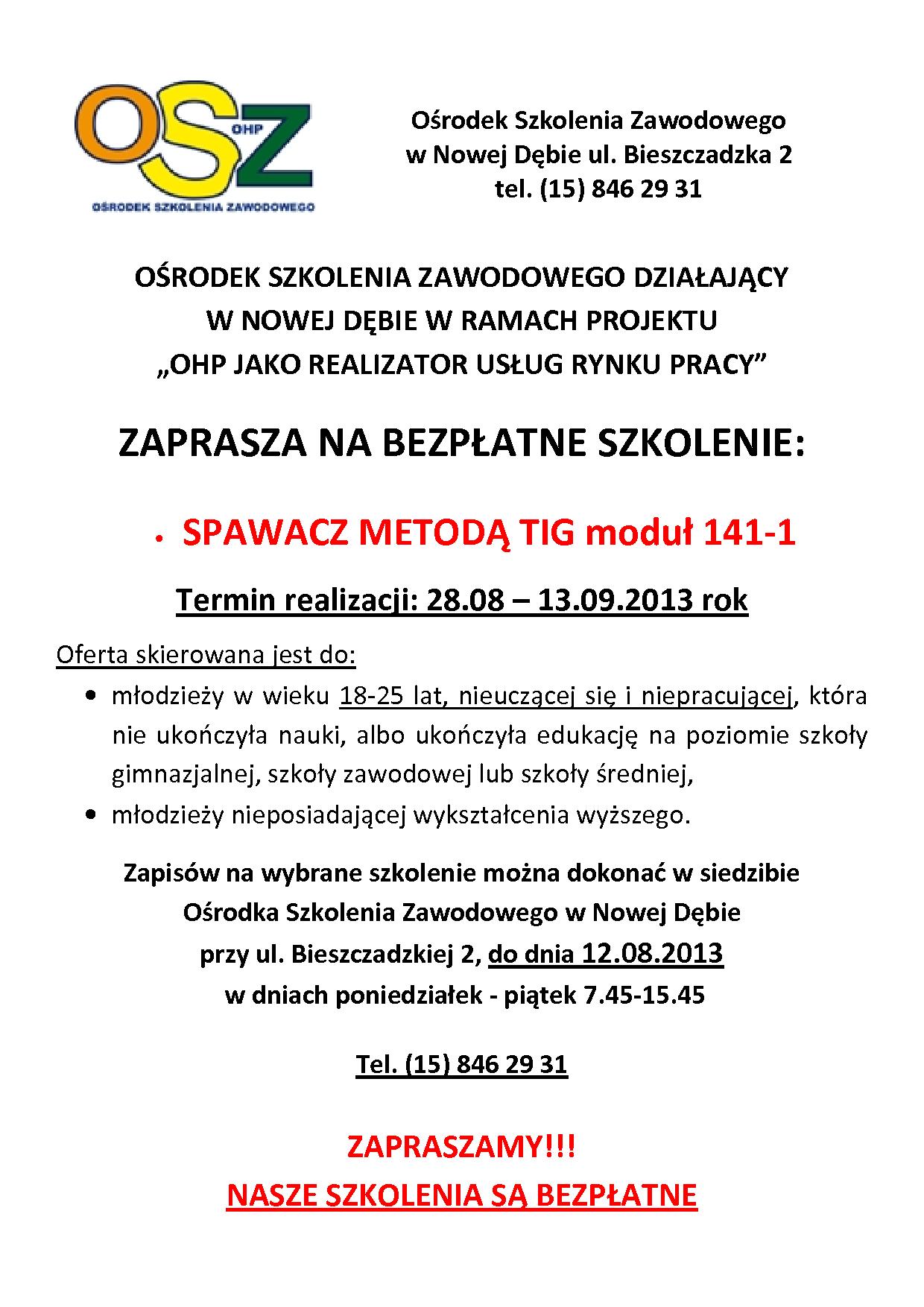 Ośrodek Szkolenia Zawodowego zaprasza na bezpłatne szkolenie - SPAWACZ METODĄ TIG moduł 141-1