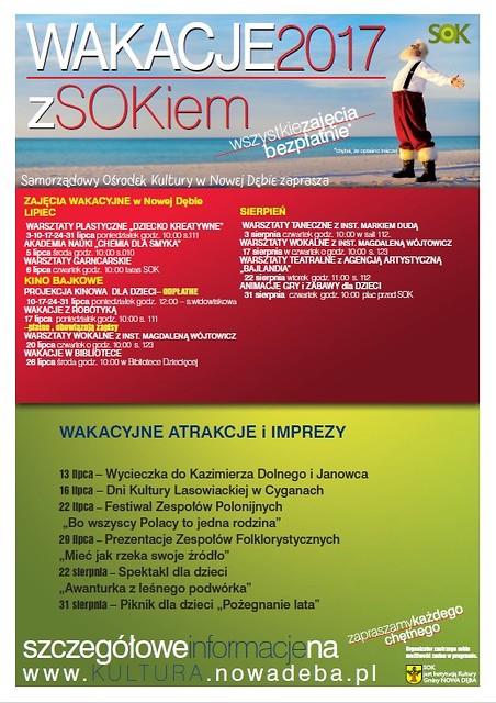 Zapraszamy dzieci w wieku szkolnym na warsztaty plastyczne pod hasłem "Dziecko kreatywne”, które odbędą się 31 lipca (poniedziałek) o godz. 10:00 w sali 111. Pod kierunkiem instruktora SOK dzieci będą mogły rozwijać się manualnie, rozbudzać własną wyobraźnię i aktywność poprzez wspólną zabawę w miłej i przyjaznej atmosferze.