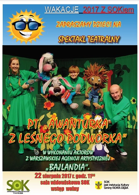 W ramach wakacji z SOK-iem zapraszamy wszystkie dzieci 22 sierpnia 2017 r. (wtorek) o godz. 11:00 na spektakl pt. "Awanturka z leśnego podwórka” w wykonaniu aktorów z warszawskiej Agencji Artystycznej "Bajlandia”.