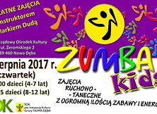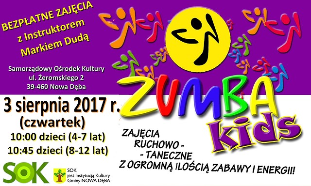 Zapraszamy wszystkie dzieci na warsztaty taneczne "Zumba Kids”, które odbędą się 3 sierpnia (czwartek) 2017 r. o godz. 10:00 w sali tanecznej SOK. Instruktor Marek Duda Zumbą Kids wprowadzi dzieci do świata tańca i fitnessu poprzez zabawę oraz proste choreografie do największych hitów muzyki popularnej i dynamicznej muzyki latynoamerykańskiej. Wstęp wolny!