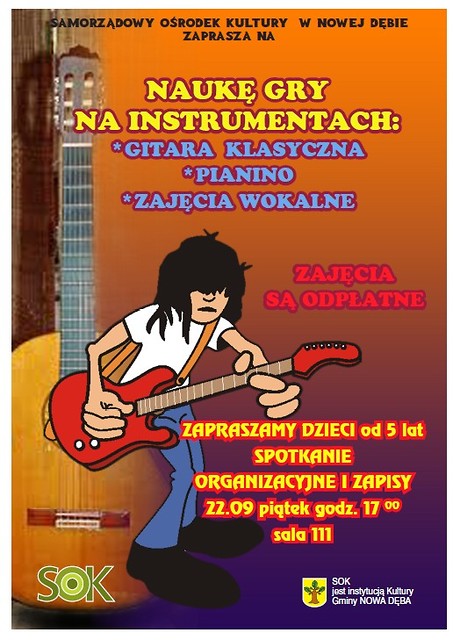 Samorządowy Ośrodek Kultury zaprasza dzieci (od 5 lat ) i młodzież na naukę gry na instrumentach: gitara klasyczna, pianino oraz warsztaty wokalne. Zajęcia prowadzić będzie Maria Bąk – absolwentka Wydziału Muzyki Uniwersytetu Rzeszowskiego. Wszystkich zainteresowanych zapraszamy na spotkanie organizacyjne w piątek 22 września 2017 r. o godz. 17:00 w sali 111. Zajęcia będą odpłatne.