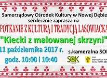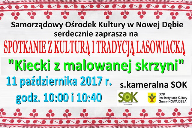 11 października 2017 r. (środa) o godz. 10:00 i godz. 10:40 w sali kameralnej SOK odbędzie się spotkanie pod hasłem "Kiecki z malowanej skrzyni”, które poprowadzi p. Maria Łączna - opiekunka zespołu "Dębianie”. Tematem spotkania będzie strój lasowiacki – omówienie poszczególnych elementów, kto nosił jaki kolor, pokaz tańca lasowiackiego. Każde dziecko będzie mogło ten strój przymierzyć, łącząc edukację z zabawą.