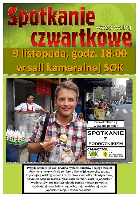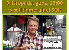 Zapraszamy na niezwykłe spotkanie czwartkowe z podróżnikiem Hubertem Budkowskim, które odbędzie się 9 listopada 2017 r. o godz.18:00 w sali kameralnej SOK. Przyjdź i zobacz kilkaset oryginalnych eksponatów z całego świata! Przymierz meksykańskie sombrero i boliwijskie poncho, zobacz imponującą kolekcję monet i banknotów z wszystkich kontynentów, przymierz rytualne maski afrykańskich plemion, skosztuj japońskich wodorostów, powąchaj najdroższej kawy świata!