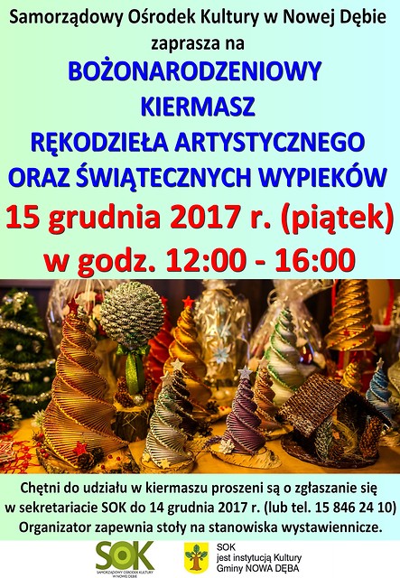 Zapraszamy lokalnych twórców z terenu miasta i gminy Nowa Dęba oraz okolic do udziału w Kiermaszu Bożonarodzeniowym, który odbędzie się 15 grudnia 2017 r. (piątek) w godz. 12:00 - 16:00 w holu dolnym SOK. Mile widziane będą dekoracje świąteczne, upominki, kartki, bombki, stroiki, serwety oraz inne przedmioty związane ze Świętami. Zapraszamy także do prezentacji specjałów świątecznej kuchni: ciast, wypieków, pierogów itp.