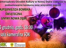 Zapraszamy wszystkich uczestników konkursu na najpiękniejszą bombkę świąteczną na rozstrzygnięcie i wręczenie nagród, które odbędzie się 15 grudnia 2017 r. o godz. 16:30 w sali kameralnej SOK. Będzie poprzedzone wspólnym ubieraniem choinki. Celem konkursu jest przybliżenie i podtrzymanie tradycji świątecznych oraz rozwijanie twórczej aktywności rodzinnej. Zapraszamy do włączenia się w kultywowanie tradycji Świąt Bożego Narodzenia!
