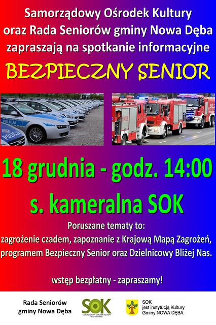 Samorządowy Ośrodek Kultury i Rada Seniorów gminy Nowa Dęba zapraszają wszystkich Seniorów 18 grudnia 2017 r. do sali kameralnej SOK o godz. 14:00 na spotkanie ze strażakiem i policjantem, dotyczące bezpieczeństwa. Poruszane tematy to: zagrożenie czadem, zapoznanie z Krajową Mapą Zagrożeń, programem Bezpieczny Senior oraz Dzielnicowy Bliżej Nas. Zapraszamy!
