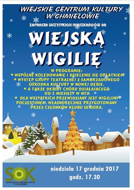 Wiejskie Centrum Kultury w Chmielowie zaprasza wszystkich mieszkańców na Wiejską Wigilię, która odbędzie się w najbliższą niedzielę tj. 17 grudnia o godz. 17.30.