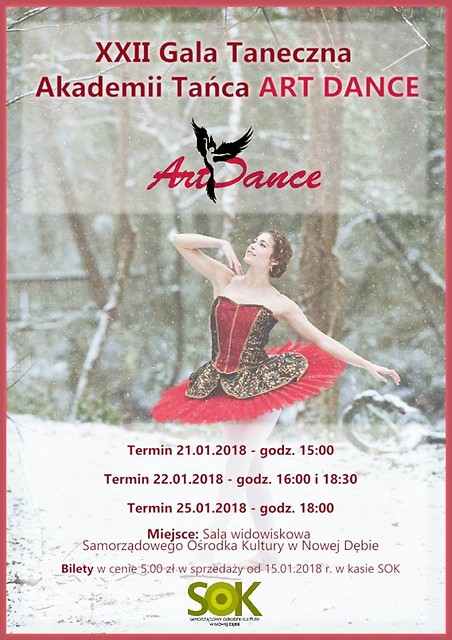 Samorządowy Ośrodek Kultury oraz Akademia Tańca Art Dance serdecznie zapraszają na XXII Galę Taneczną. W tej odsłonie będą to 4 gale w ciągu 3 dni. Na każdej tancerze - Ci mali i Ci całkiem dorośli - będą prezentować swoje umiejętności w różnych technikach tanecznych. Oprócz tańca usłyszymy piosenki w wykonaniu Natalii Gazdy, Patrycji Wilk, Katarzyny Drzał, Pauliny Buś oraz Oliwii Łukawskiej. Zapraszamy do sali widowiskowej SOK w następujących terminach: