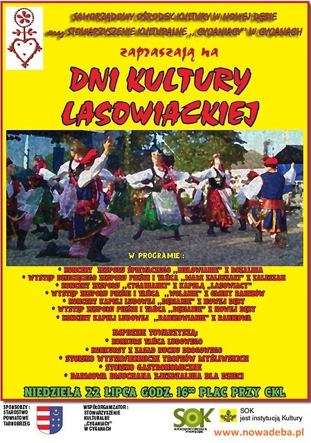Samorządowy Ośrodek Kultury w Nowej Dębie oraz Stowarzyszenie Kulturalne "Cyganiacy" w Cyganach zapraszają na XI Dzień Kultury Lasowiackiej w Cyganach, który odbędzie się 22 lipca 2018 r. (niedziela) od godz. 16:00 na placu przy CKL. To kolejna edycja wydarzenia, podczas którego zaprezentują się zespoły ludowe, kapele oraz grupy tańca ludowego, które wezmą udział w konkursie na najlepiej wykonaną polkę i oberka. To święto kultury ludowej we wsi Cygany, uznawanej za kolebkę kultury lasowiackiej - wydarzenie promujące tę kulturę w naszym regionie. Działa tu kilka zespołów ludowych, skupiających w swoich szeregach trzy pokolenia, wielu uzdolnionych artystów amatorów zajmuje się rękodziełem artystycznym. Również w Cyganach zarejestrowanych jest kilka potraw regionalnych, które otrzymały prestiżowy certyfikat potrawy tradycyjnej.