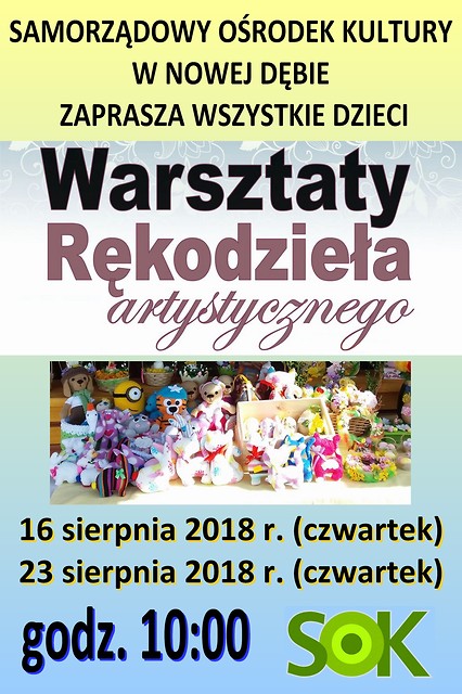 Samorządowy Ośrodek Kultury w Nowej Dębie serdecznie zaprasza wszystkie dzieci na warsztaty rękodzieła artystycznego, które odbędą się w dniach 16 i 23 sierpnia 2018 r. o godz. 10:00.