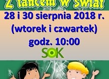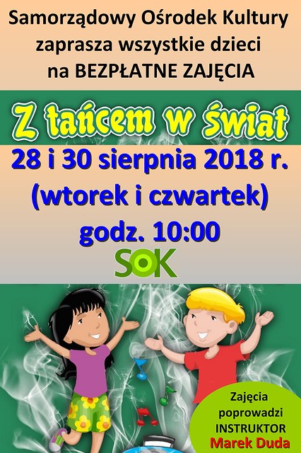 Zapraszamy wszystkie dzieci na warsztaty taneczne, które odbędą się 28 oraz 30 sierpnia 2018 r. (wtorek i czwartek) o godz. 10:00 w sali tanecznej SOK. Instruktor Marek Duda wprowadzi dzieci do świata tańca i fitnessu poprzez zabawę oraz proste choreografie do największych hitów muzyki popularnej i dynamicznej muzyki latynoamerykańskiej. Wstęp wolny!