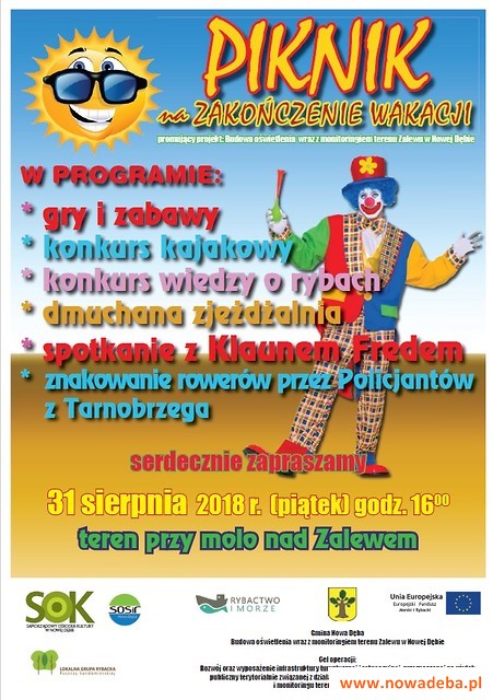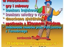 W ramach zakończenia Wakacji w imieniu wszystkich organizatorów serdecznie zapraszamy wszystkie dzieci wraz z rodzicami na piknik, który odbędzie się 31 sierpnia 2018 r. od godz. 16:00 na terenie przy molo nad Zalewem. W programie przewidziano: gry i zabawy, konkurs kajakowy, konkurs wiedzy o rybach, dmuchana zjeżdżalnia. Będzie to kolejne wspaniałe spotkanie z Klaunem Fredem. Ponadto w tym dniu Policjanci z Tarnobrzegu będą zachęcać właścicieli rowerów do bezpłatnego znakowania pojazdów. Zapraszamy do włączenia się w akcję.