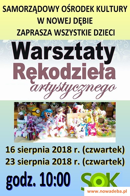 Samorządowy Ośrodek Kultury w Nowej Dębie serdecznie zaprasza wszystkie dzieci na warsztaty rękodzieła artystycznego, które odbędą się w dniach 16 i 23 sierpnia 2018 r. o godz. 10:00.
