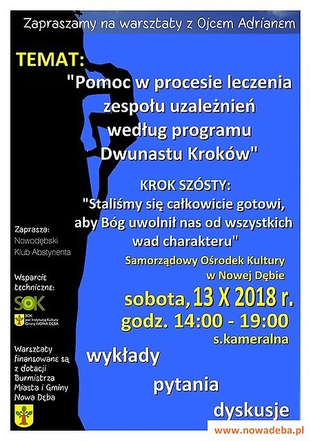 Nowodębski Klub Abstynenta zaprasza wszystkich zainteresowanych problematyką związaną z uzależnieniami, współuzależnieniami od alkoholu. Sposobami wyjścia z nałogu i radzenia sobie w trzeźwym życiu. Drugi cykl warsztatów poprowadzi Orędownik trzeźwego życia, terapeuta, zakonnik Ojciec Adrian