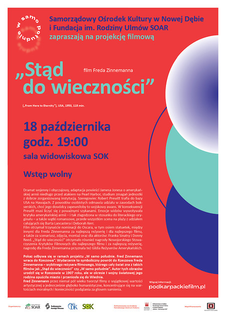 Samorządowy Ośrodek Kultury w Nowej Dębie i Fundacja im. Rodziny Ulmów SOAR zapraszają na projekcję filmu Freda Zinnemanna „Stąd do wieczności” („From Here to Eternity”, USA, 1953, 118 min.), która odbędzie się w czwartek, 18 października, o godz. 19.00 w sali widowiskowej SOK.