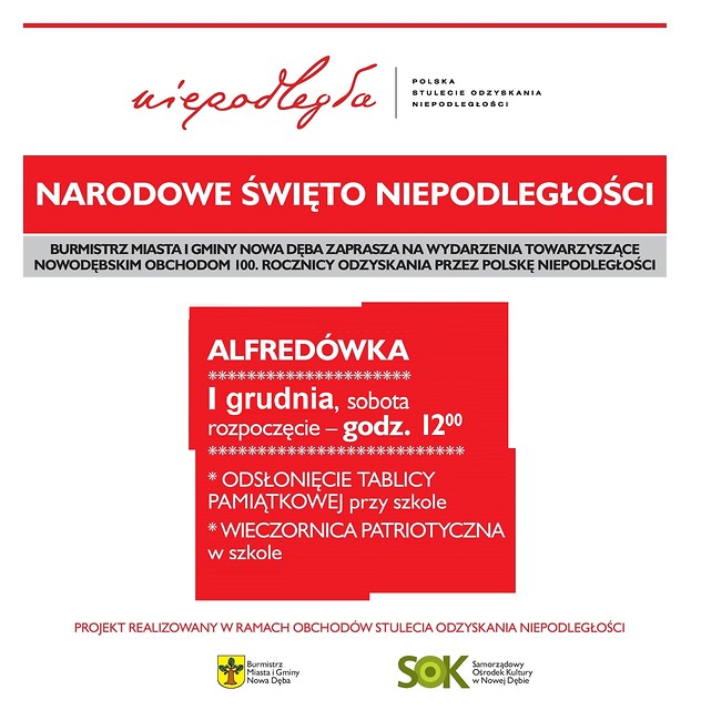 Burmistrz Miasta i Gminy Nowa Dęba zaprasza na wydarzenie towarzyszące nowodębskim obchodom 100. rocznicy odzyskania przez Polskę Niepodległości, które odbędzie się 1 grudnia (sobota) w Alfredówce.