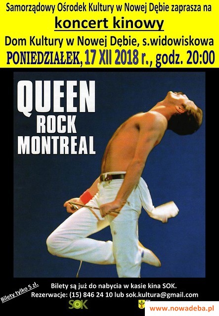 Zapraszamy na kinowy koncert QUEEN ROCK MONTREAL & LIVE AID, który odbędzie się w poniedziałek, 17 grudnia 2018 r. o godz. 20:00 w sali widowiskowej Samorządowego Ośrodka Kultury w Nowej Dębie.
